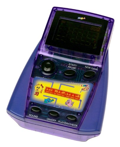 It's old school meets new technology with the handheld Color FX II: Ms. Pacman game, a miniaturized makeover of the classic arcade favorite. It would be a tempting overstatement to suggest that, in the intervening 20-plus years, the color LCD graphics of this new format have surpassed those of the quarter-gobbling original, but the Color FX II (powered by four AA batteries, not included) does provide a faithful re-creation of the traditional Ms. Pacman pursuit. Players still direct that rose-colored cutie through the maze as she chomps as many dots as possible while eluding the green ghosts. The FX II, with its slick, translucent mauve chassis, features optional arcade sounds; although, with six control buttons, it's a bit of a shame that the Ms. Pacman navigation function--in all four directions--has been shoe-horned onto one button smaller than your thumb. And, depending on the brightness of your room, the display tends to be a little on the dark side. But, quibbles aside, whether you're nostalgic for or curious about arcade history, there's a lot to like in this original palm pilot. --Tony Mason
